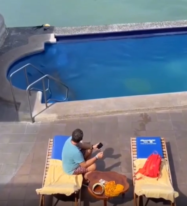 한적한 수영장, 한 남자가 선베드에 앉아 쉬고 있습니다. 물놀이를 마친 듯 조용히 휴식을 즐기고 있던 그때, 물속에서 무언가가 다가오기 시작합니다. 바로 물개입니다.