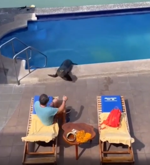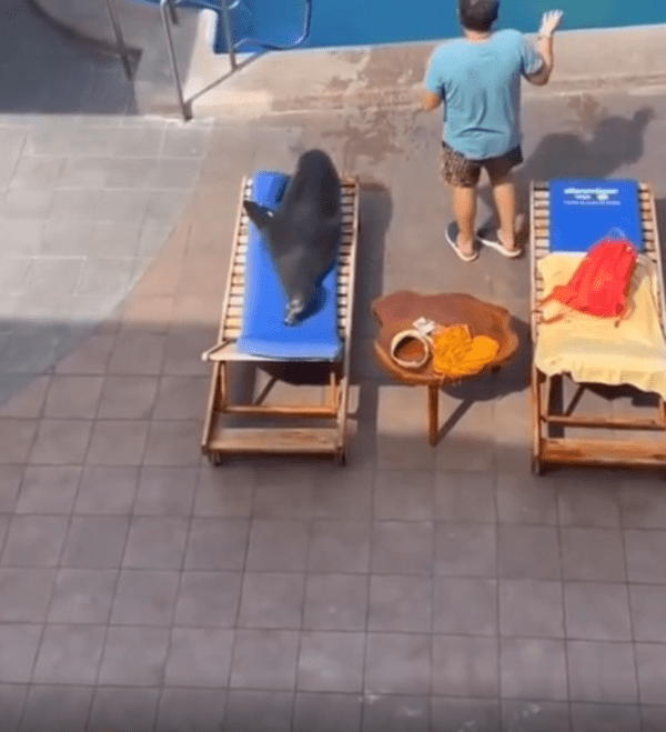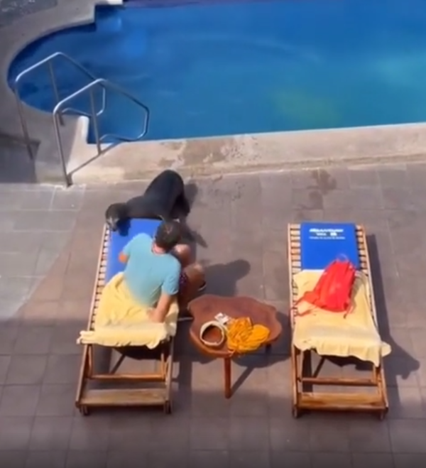 물개는 수영장에서 천천히 헤엄쳐 나오더니, 자연스럽게 남자를 향해 다가옵니다. 남자는 이를 보고 있지만, 아직 이 상황이 어떻게 흘러갈지 예측하지 못한 듯합니다. 하지만 물개는 확신이 있는 듯 꾸준히 앞으로 나아갑니다. 그리고 어느 순간, 거침없이 선베드 위로 몸을 들이밀기 시작합니다.