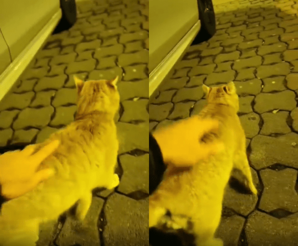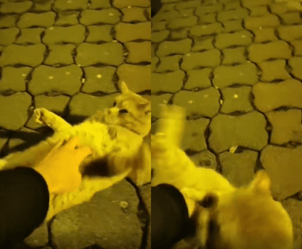 고양이가 천천히 걸어가고 있습니다. 그러다 손길이 다가오자 걸음을 멈추고 몸을 낮춥니다. 손이 부드럽게 등을 쓰다듬자, 고양이는 더욱 만족한 듯 몸을 뒤집으며 더 많은 쓰다듬기를 원하듯 행동합니다. 마치 “그래, 더 만져줘도 돼.”라고 말하는 듯한 모습입니다.