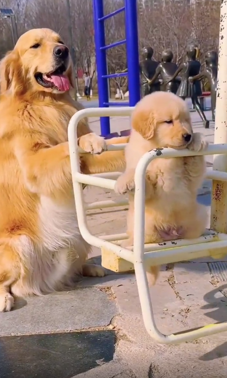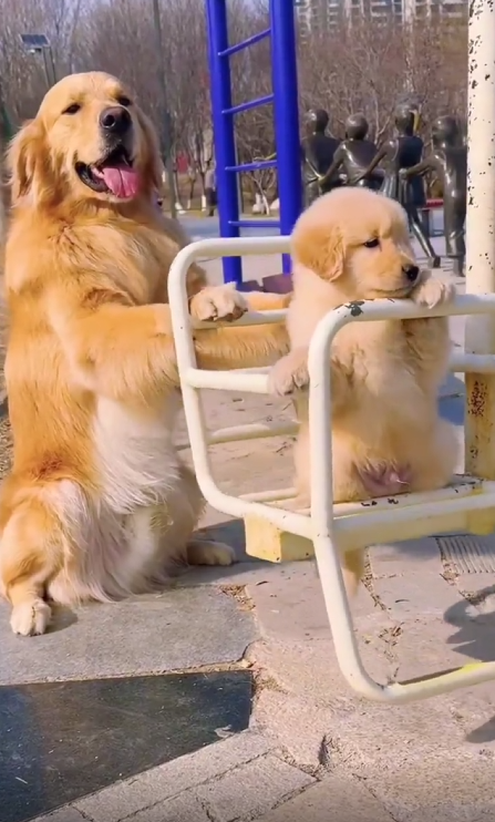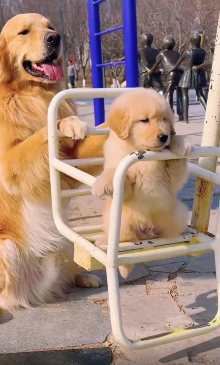 “엄마 손길이 최고야!” 그네를 탄 강아지를 살살 밀어주는 어미 개