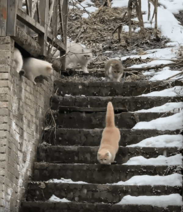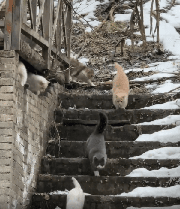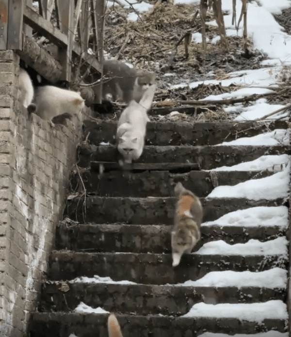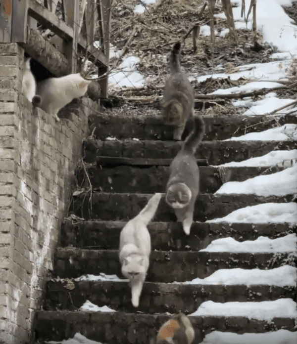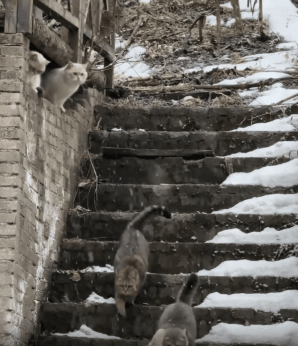 “눈은 피해 가는 게 답이지!” 신중하지만 거침없이 계단을 내려가는 고양이들