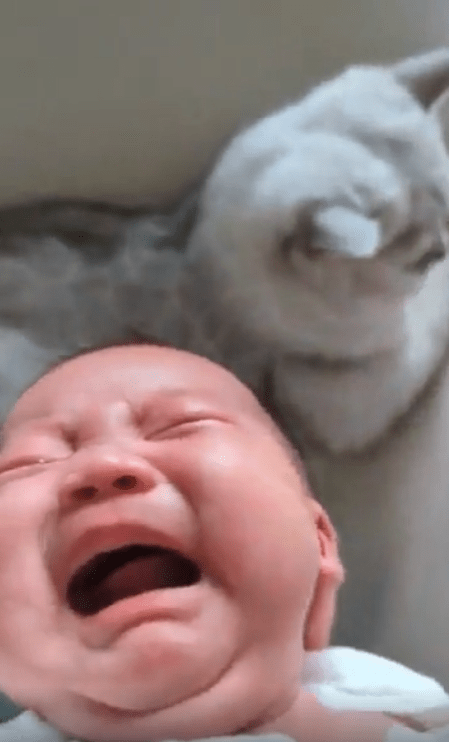 출처 : Reddit / 우는 아기를 고양이 등위에 내려놓는다