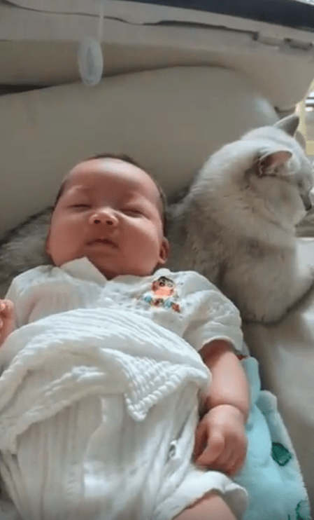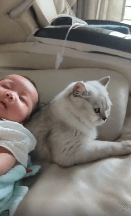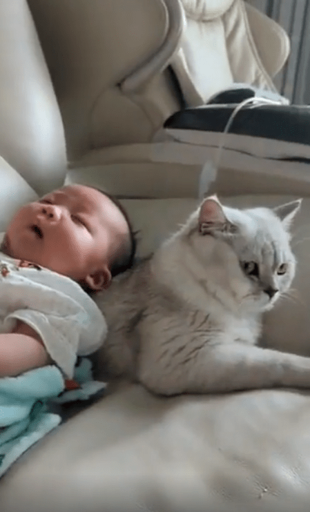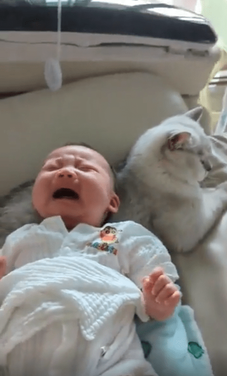 그런데 주인이 조심스럽게 아기를 고양이의 등에 내려놓습니다. 순간, 마법 같은 일이 벌어집니다. 방금 전까지 울음을 터뜨리던 아기가, 마치 마법이 걸린 듯 갑자기 조용해집니다. 부드럽고 따뜻한 고양이의 몸 위에서 아기는 금세 안정을 찾고, 그치지 않을 것 같던 울음은 순식간에 멎어버립니다.