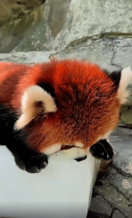 앞발을 앞으로 쭉 뻗고, 몸 전체를 얼음에 최대한 밀착시키며 온몸으로 시원함을 느끼고 있는 레서팬더. 눈을 살짝 감고 있는 모습에서 절대 이곳을 떠날 생각이 없어 보이는 강한 의지가 느껴집니다. 확실히 이 순간만큼은 세상에서 가장 행복한 동물일지도 모릅니다.