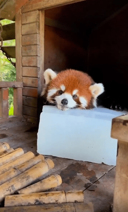 레서팬더 한 마리가 얼음 위에 몸을 바짝 붙이고 있습니다. 뜨거운 날씨에 지쳤는지, 차가운 표면을 만난 순간 그대로 녹아내린 듯한 모습입니다. 마치 "이제야 살 것 같다…"라고 말하는 듯한 편안한 자세가 눈길을 끕니다.