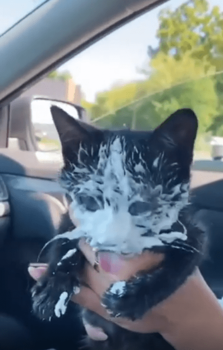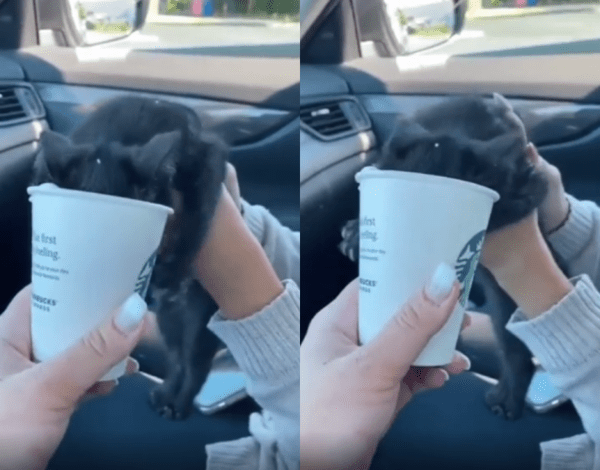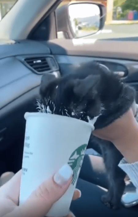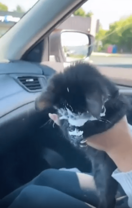 차 안, 주인이 크림이 담긴 컵을 조심스럽게 고양이 앞으로 가져갑니다. 고양이는 순간 두 눈을 반짝이며 관심을 보입니다. "이게 뭐지? 냄새가 너무 좋은데?" 마치 그렇게 말하는 듯한 표정입니다.