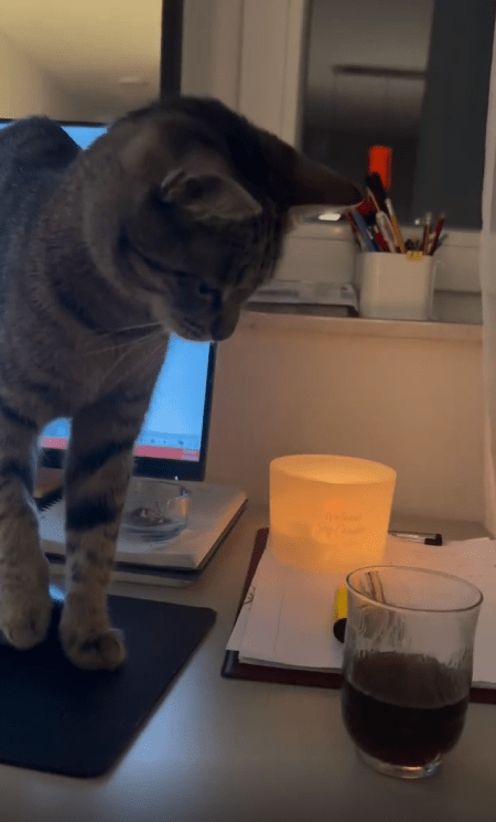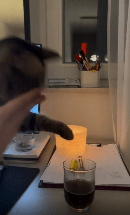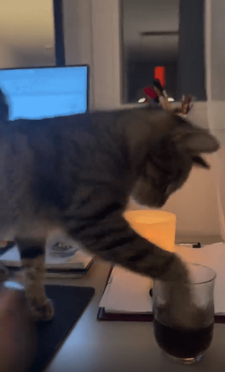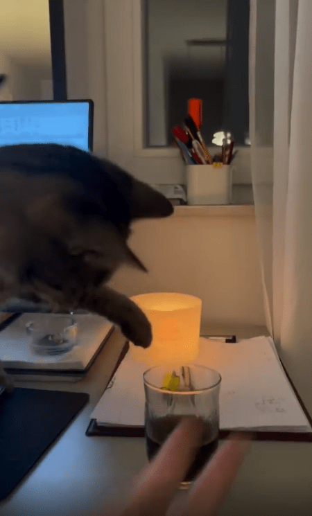 그런데 바로 그 순간, 주인이 빠르게 반응합니다. 고양이의 앞발이 컵에 닿기 직전, 손으로 재빠르게 고양이의 움직임을 막습니다. 고양이는 순간 움찔하며 멈춥니다. 하지만 그렇다고 포기할 고양이가 아닙니다.