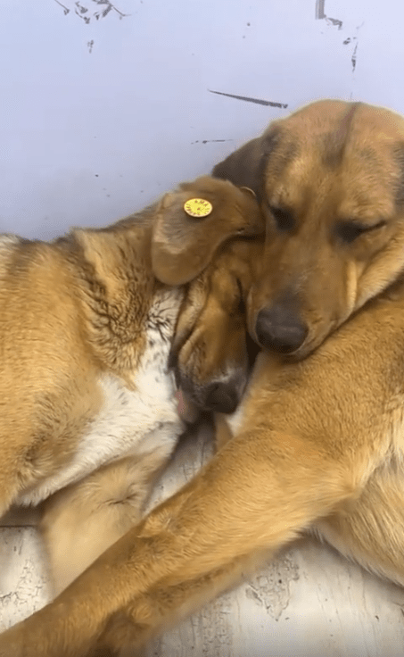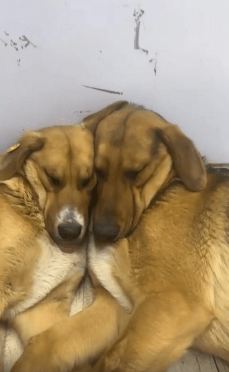 한 강아지는 얼굴을 살짝 옆으로 기울인 채 다른 강아지의 머리에 얼굴을 살포시 기대고 있습니다. 다른 강아지는 편안하게 눈을 감고 코끝이 살짝 움직입니다. 두 강아지의 숨소리가 일정하게 들리며, 몸이 규칙적으로 오르내립니다. 두 강아지가 서로를 완전히 신뢰하고 있다는 것이 느껴지는 순간입니다.