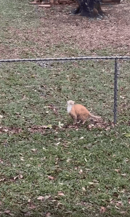 그때 강아지 한 마리가 고양이를 발견합니다. 강아지는 잽싸게 달려와 울타리 위에 몸을 걸친 고양이를 바라봅니다. 그러더니 망설임 없이 고양이 쪽으로 다가가 코로 살짝 고양이의 몸을 밀어냅니다. 고양이가 버티려 하지만, 강아지는 다시 한 번 몸을 밀어냅니다. 결국 고양이는 중심을 잃고 울타리에서 땅으로 떨어지고 맙니다.