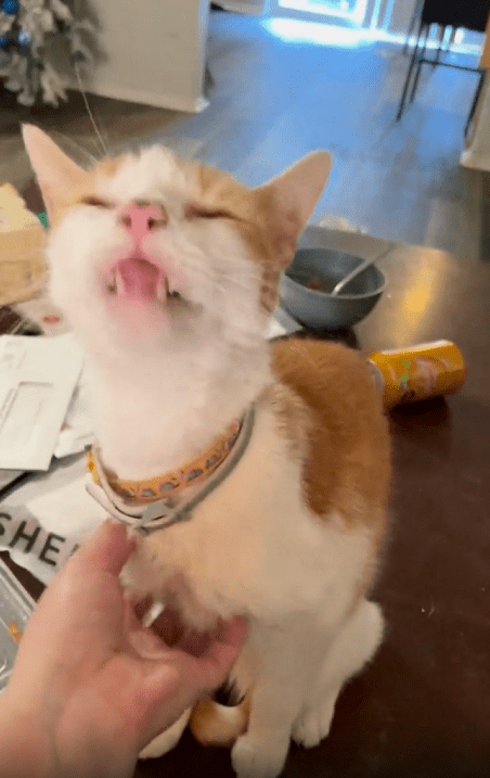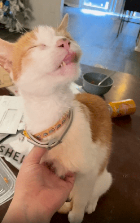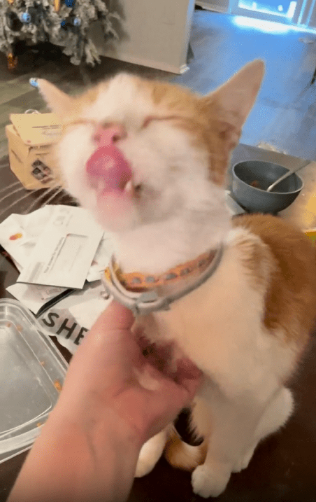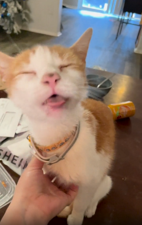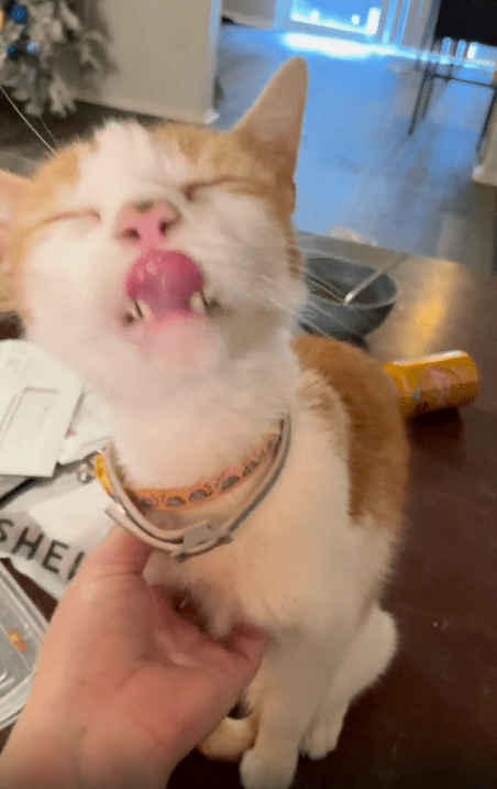 주인이 계속 긁어주자 고양이는 눈을 살짝 감으며 기분 좋은 듯한 표정을 짓습니다. 그러면서도 혀는 멈추지 않고 계속 낼름거립니다. 자연스럽고 반복적인 반응이 너무 사랑스럽습니다.