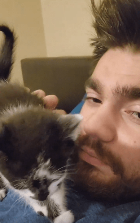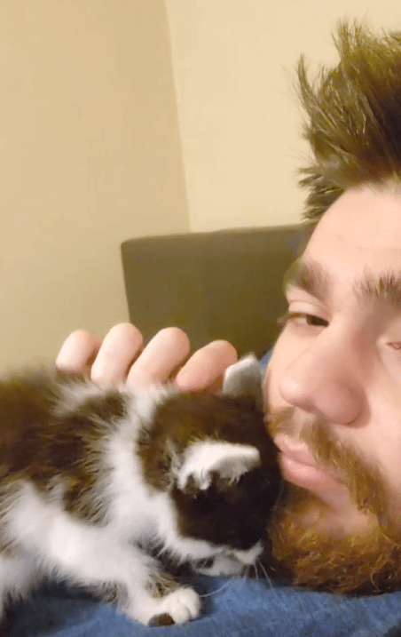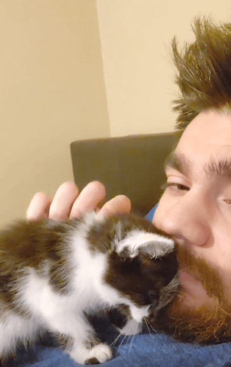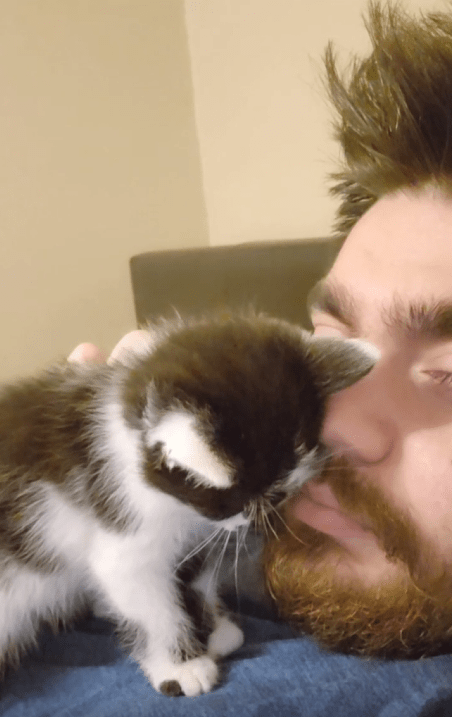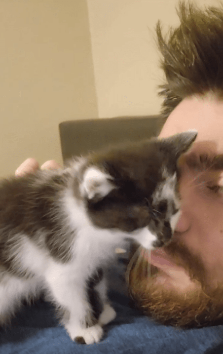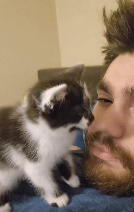 새끼 고양이가 남주인의 가슴 위에 올라가 편안하게 자리 잡고 있습니다. 고양이는 주인의 얼굴에 자신의 얼굴을 살며시 부비며 애정을 표현합니다. 주인은 고양이를 부드럽게 쓰다듬으며 따뜻한 분위기를 자아냅니다. 고양이의 느긋한 움직임에서 주인에 대한 깊은 신뢰와 애정이 느껴집니다.