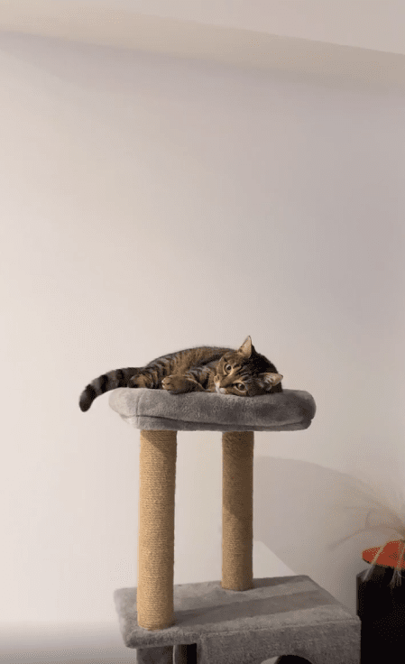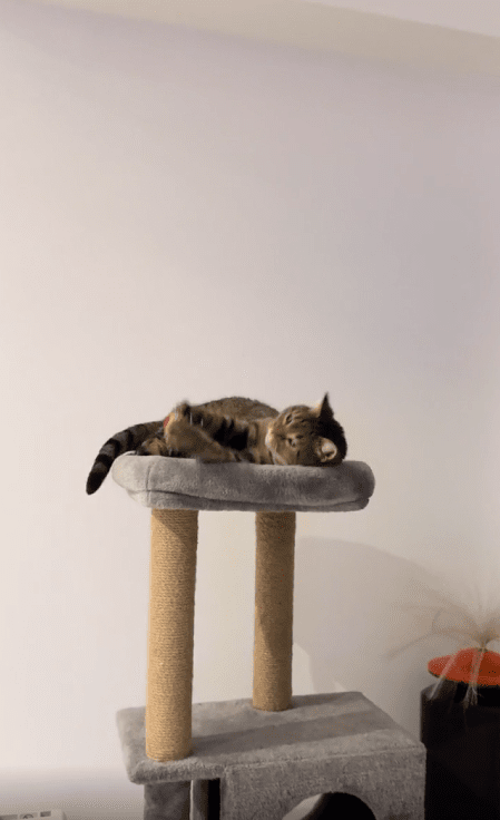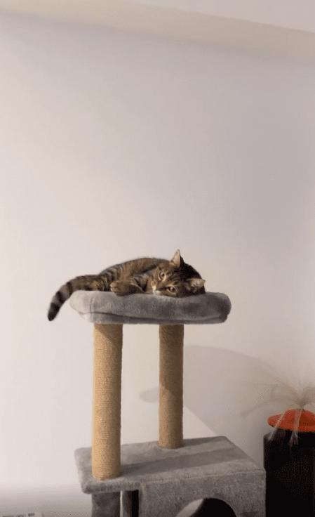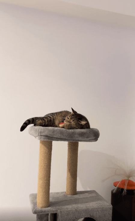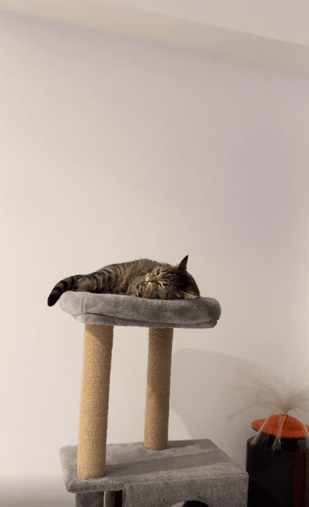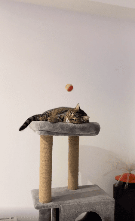 캣타워 위에 편안히 누워있던 고양이에게 공이 날아갑니다. 그런데 고양이는 눈 깜짝할 사이에 공을 정확히 받아냅니다. 공이 손에 닿자마자 입으로 가져가더니, 마치 사냥감을 포획한 듯 공을 물어뜯기 시작합니다. 고양이의 놀라운 반사 신경과 빠른 반응이 인상적입니다.