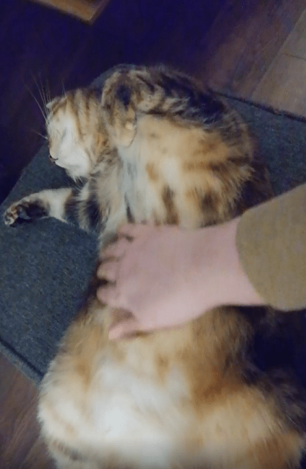주인이 계속해서 부드럽게 쓰다듬자, 고양이는 더욱 편안한 상태가 됩니다. 몸의 움직임도 거의 없이 그대로 배를 드러낸 채 주인의 손길을 온전히 즐기고 있습니다. 신뢰와 안정감이 고스란히 전해지는 순간입니다. 고양이의 몸이 점점 더 풀어지며 온전히 주인의 손길에 집중하고 있는 모습이 정말 사랑스럽습니다.