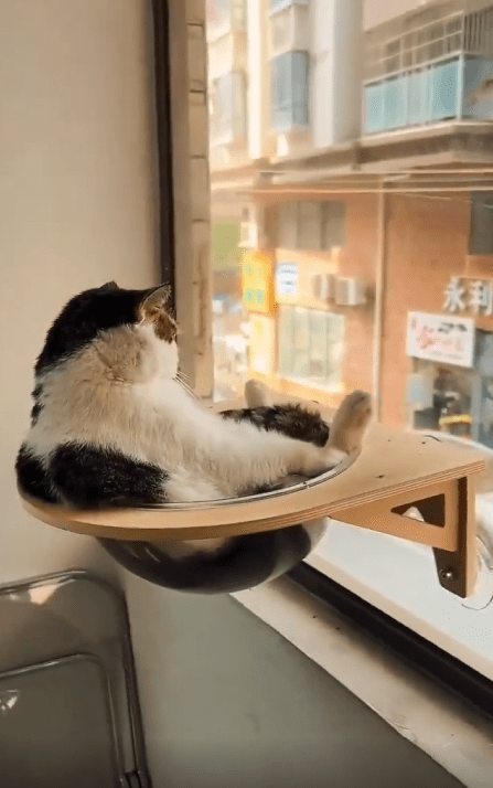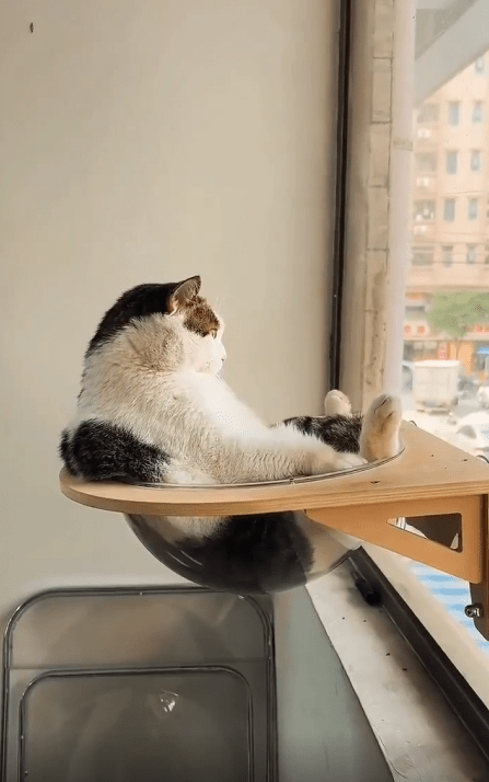 창문에 부착된 작은 볼 그릇 안에 고양이가 뒷발을 편 채로 앉아 있습니다. 편안한 자세로 창밖을 바라보는 모습이 마치 왕국을 지키는 왕의 위엄을 풍깁니다. 몸의 힘을 뺀 상태에서 안정적으로 앉아 있는 고양이는 창밖의 풍경을 조용히 감상하고 있습니다. 고양이의 꼿꼿한 자세와 침착한 표정에서 고양이만의 여유로움이 느껴집니다.
