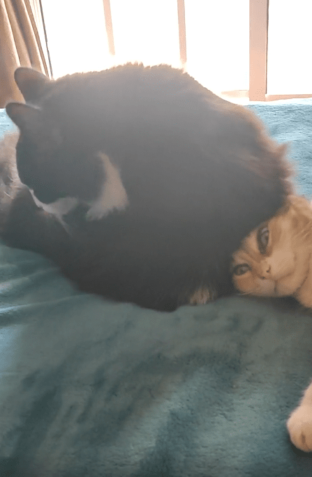고양이들은 서로에게 완전히 마음을 놓은 듯 보입니다. 허리를 머리에 기댄 고양이는 상대가 불편해할까 걱정하지 않고 자연스럽게 행동하고 있습니다. 반면 누운 고양이도 그런 행동을 아무렇지 않게 받아들이며 편안함을 유지하고 있습니다. 서로에 대한 깊은 신뢰와 애정이 느껴지는 순간입니다.