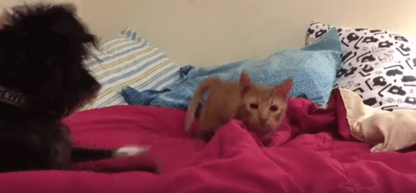 강아지의 순발력으로 고양이를 막아내다