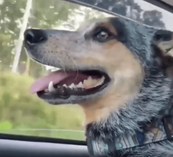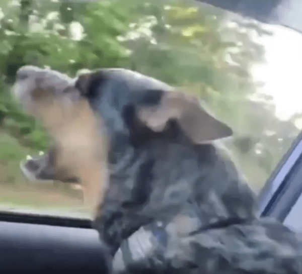 강아지가 달리는 차의 열린 창문에서 고개를 내밀고 밖을 바라보고 있습니다. 그러다 반대편에서 다른 차가 지나가는 순간, 강아지가 갑자기 입을 쩍 벌리고 그 차를 깨물 듯한 반응을 보입니다. 마치 상대 차를 향해 한 입 베어 물고 싶은 듯한 모습입니다.