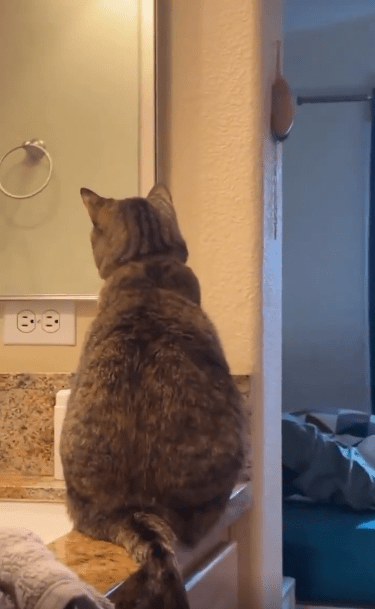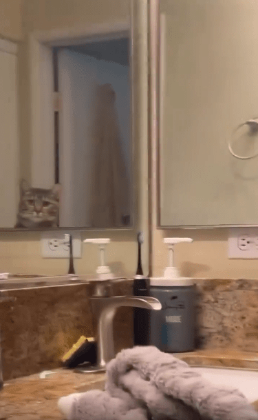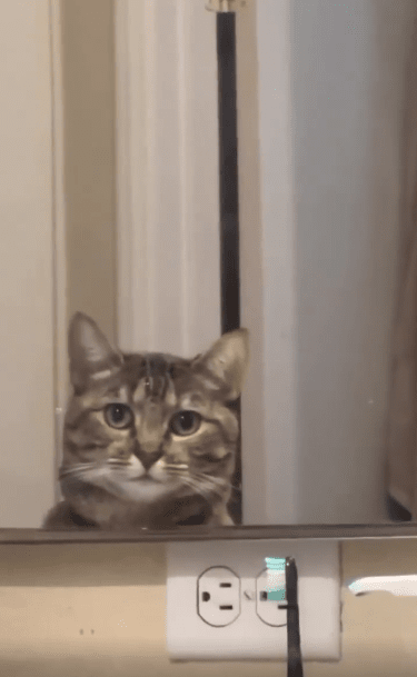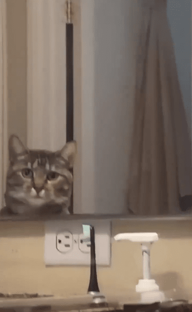 고양이가 벽 쪽을 주시하고 있습니다. 마치 벽에 뭔가가 있는 것처럼 초집중한 상태입니다. 그런데 카메라 시점이 살짝 돌아가면서 진짜 이유가 드러납니다. 고양이는 벽을 보고 있는 게 아니라, 벽에 걸린 거울을 통해 자신을 찍고 있는 주인을 바라보고 있었습니다.