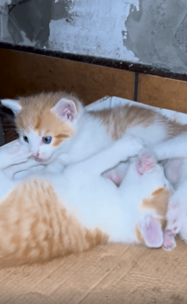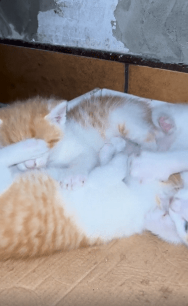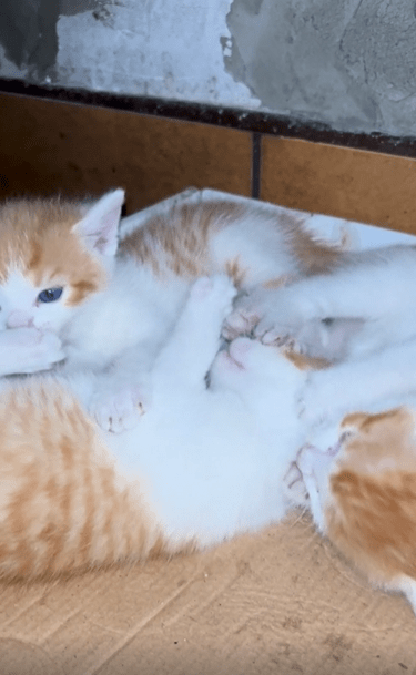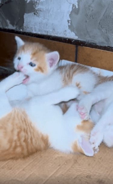 세 마리의 새끼 고양이가 서로 엉켜 장난을 치고 있습니다. 한 마리가 다른 고양이를 깨물자 나머지 고양이도 지지 않고 반격하며 셋이서 몸을 뒤엉키며 굴러다닙니다. 처음에는 살짝 깨무는 수준이지만, 점점 강도가 세지자 깨물린 고양이들이 반응하며 장난을 이어갑니다.