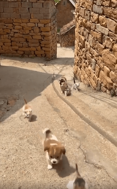 고양이 가족이 옹기종기 움직이는 그 속에, 뭔가 조금 다른 아이 하나가 있습니다. 전체적으로 비슷한 크기지만, 얼굴형이 다르고 동글동글한 몸매를 가진 작은 강아지 한 마리. 그런데 놀랍게도 이 강아지는 고양이 무리 속에서 전혀 어색하지 않습니다. 귀가 살짝 접혀 있고, 털은 부드럽지만 고양이들보다 조금 더 두툼해 보입니다. 하지만 그 모습조차 이 작은 가족 안에서는 완벽하게 어우러져 보입니다.