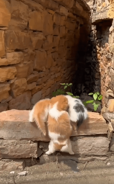 어미 고양이는 강아지를 향해 조용히 다가가더니, 익숙하다는 듯 입을 내밀어 얼굴을 천천히 핥아줍니다. 마치 자기 새끼에게 하듯, 섬세하고 조심스럽게. 종이 다르다는 사실은 전혀 중요하지 않은 듯한 태도입니다. 그루밍을 받는 강아지는 눈을 감은 채 조용히 그 애정을 받아들입니다. 살짝 떨리는 숨결, 움직이지 않고 고요히 머물러 있는 자세에서 ‘신뢰’가 느껴집니다.