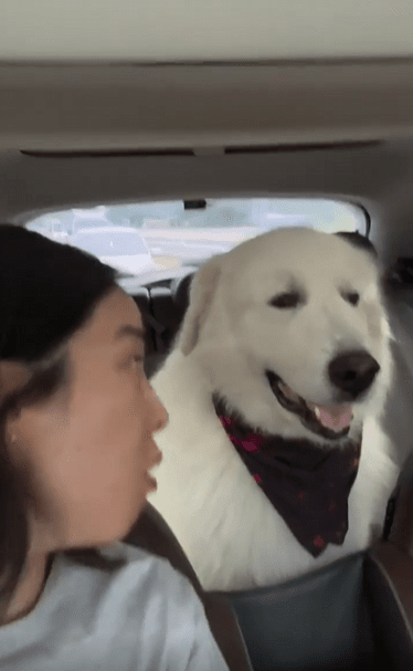 차 안, 조용한 분위기 속. 앞자리에 앉은 여성은 살짝 장난기가 어린 표정을 짓더니 갑자기 개 짖는 소리를 크게 흉내 냅니다. “멍!” 다소 과장된 그 소리에 차 안의 정적이 순간 깨지고, 뒷좌석에 앉아 있던 강아지의 반응이 시작됩니다.