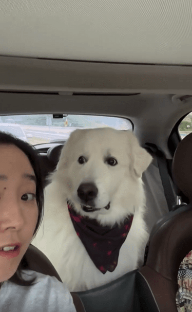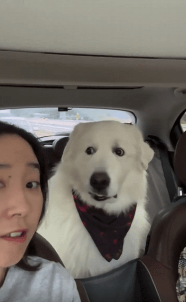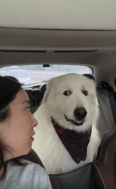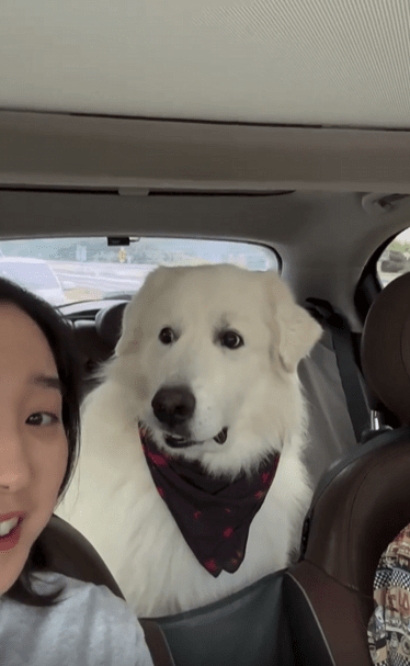 ‘설마 지금… 나한테 짖은 거야?’ 그런 말이 진짜로 들릴 것만 같은 눈빛. 귀는 살짝 젖혀져 있고, 눈은 동그랗게 뜬 채 여자를 뚫어져라 바라봅니다. 그 모습은 단순히 웃긴 게 아니라, 감정이 있는 한 마리의 존재처럼 보입니다. ‘이 차에서 짖는 건 나였잖아? 감히 너가 나한테 짖어?’ 표정 하나로 이 많은 이야기를 해내다니, 정말 대단한 연기력입니다.