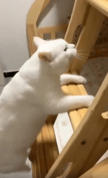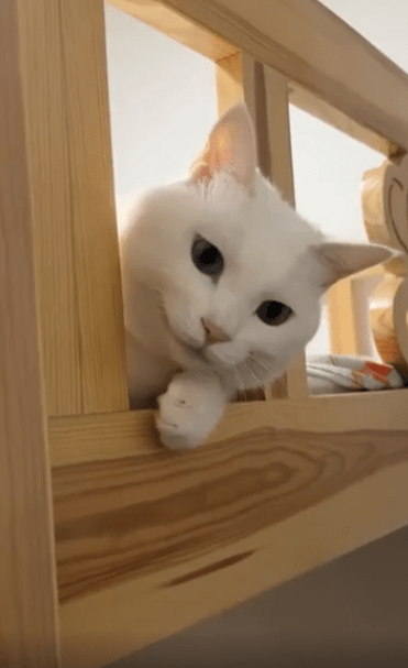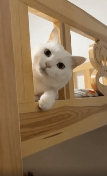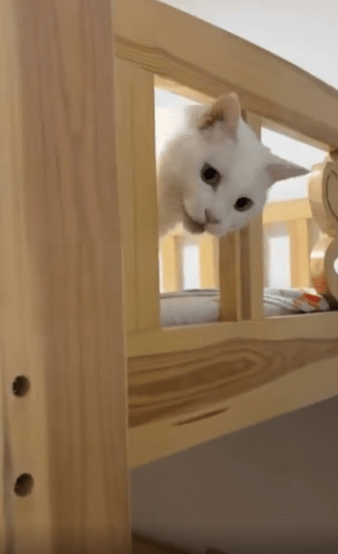 좁은 계단을 또각또각 오르더니, 고양이 한 마리가 2층 침대 위로 올라옵니다. 그리고는 침대 끝에 설치된 가드레일 사이로 얼굴을 쏙 내밉니다. 떨어짐을 막기 위한 보호용 구조물이지만, 고양이에게는 마치 대화용 창처럼 보였던 걸까요. 그 틈 사이에 얼굴을 꼭 맞춰 넣은 고양이는 눈을 동그랗게 뜨고 조용히, 그러나 단호하게 무언가를 바라보고 있습니다.