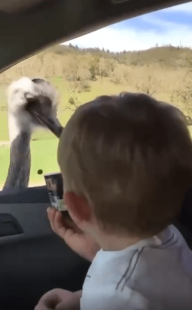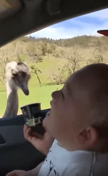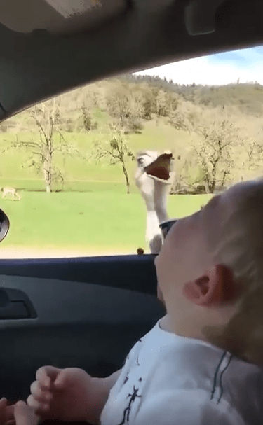 그 광경에 아기는 눈을 동그랗게 뜨더니 곧장 터져 나오는 듯한 웃음을 쏟아냅니다. “까르르!” 처음엔 놀란 듯하다가, 타조가 한 번 부리를 넣을 때마다 웃음소리가 터집니다. 타조가 먹이를 쪼면 아기가 웃고, 아기가 웃으면 타조는 다시 부리를 밀어넣고… 그렇게 짧은 순간 동안 차 안엔 웃음이 연달아 퍼집니다.