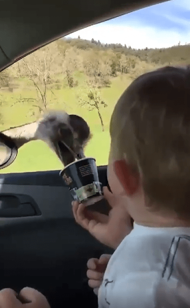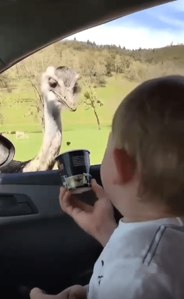 조수석 창문이 열린 차 안, 뒷좌석에서 누군가가 조심스레 손을 뻗어 먹이가 담긴 컵을 내밀고 있습니다. 그 옆 조수석엔 아기가 앉아 상황을 신기하게 지켜보고 있죠. 그러던 순간, 차 밖에서 기다렸다는 듯 나타난 타조 한 마리가 스윽—하고 긴 목을 내밉니다.