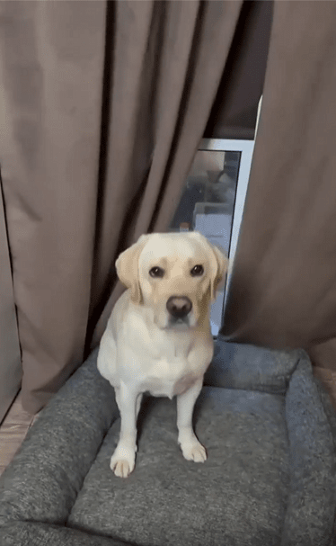 그런데 바로 그 옆, 같은 방석 위에는 한 마리의 개가 서 있습니다. 움직이지 않고, 조용히 서 있는 이 개는 왠지 모르게 신중한 기운을 풍깁니다. 그리고 이내, 조금씩 조심스럽게 행동을 시작합니다. 주둥이를 고양이 쪽으로 내밀어 살짝—툭. 한 번 건드리고, 다시 툭. 또 한 번.