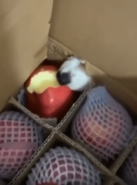 움직임은 아주 조심스럽고, 묘하게 진지합니다. 박스 안쪽을 향해 숨을 들이쉬고, 사과를 향해 천천히 입을 벌리더니, 아주 작은 오물거림이 시작됩니다. 꺼내서 먹는 것도 아니고, 흘리거나 난장판을 만드는 것도 아닙니다. 그저 구멍 안에서만 조용히, 살짝씩 맛을 보고 있는 중이죠. 딱 한 입만. 아니, 한 입을 여러 번 나눠서 먹는 것처럼요.