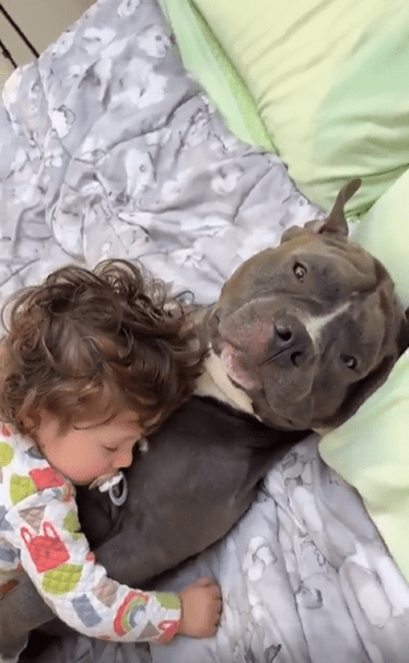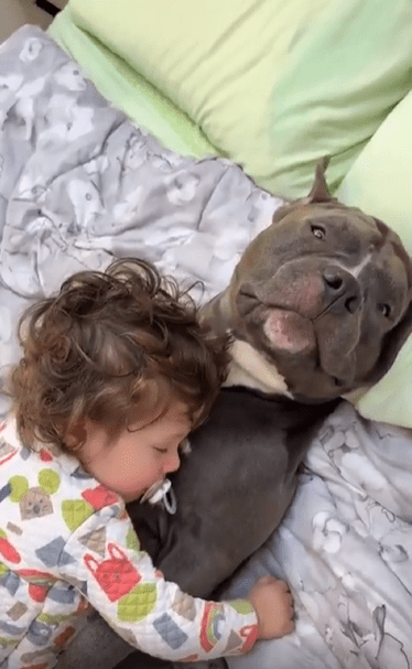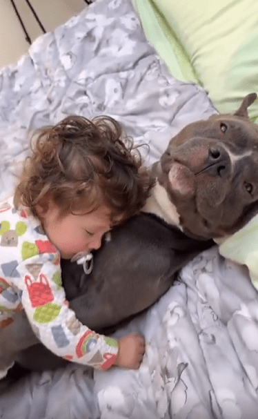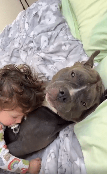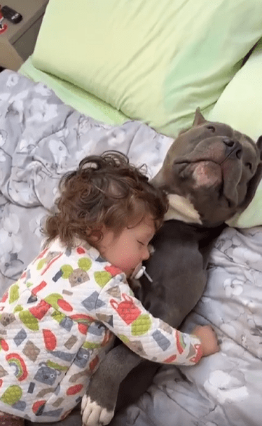 출처 : Reddit / 강아지를 껴안고 자는 아기
