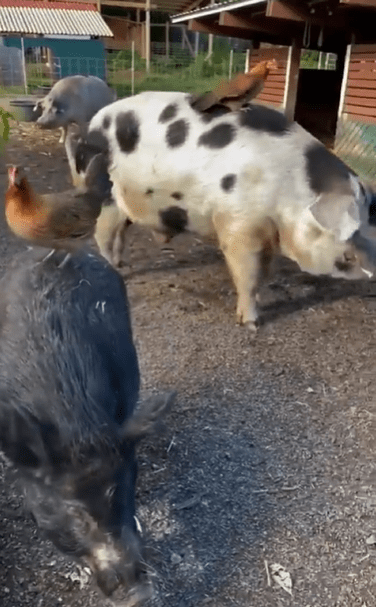 사육장 한가운데, 몇 마리의 돼지들이 제 갈 길을 걷고 있습니다. 어떤 돼지는 천천히 움직이고, 어떤 돼지는 서 있는 채 주변을 살핍니다. 그런데 그 위, 예상치 못한 위치에 닭들이 올라타 있습니다. 돼지의 넓은 등 위에 딱 맞게 올라앉은 채, 날지도 걷지도 않고 묵묵히 앉아 있는 닭들. 그 모습은 마치 자연의 택시 서비스가 가동 중인 듯한 풍경입니다.