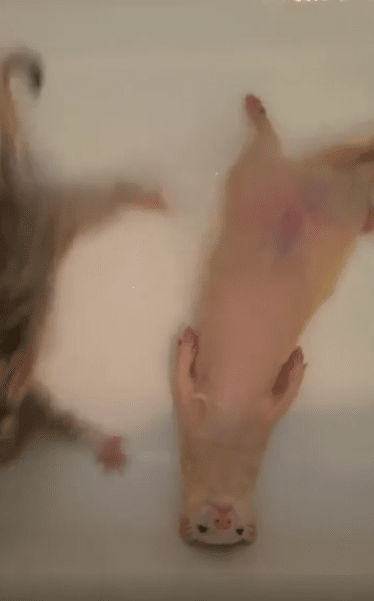 하지만 그 가운데, 딱 한 마리의 패럿은 완전히 다른 반응을 보였습니다. 물이 쏟아지는 와중에도 그저 욕조 바닥에 등을 댄 채 축 늘어져 누워 있었죠. 앞발은 가지런히 모여 있었고, 몸 전체는 마치 무게를 잃은 듯 흐느적이며 그 자리에 가만히 있었습니다. 고개도 들지 않았고, 움직일 기색조차 없이 물을 조용히 맞고 있는 모습은 어떤 면에서는 너무도 평온해 보였습니다. 다른 패럿들이 이 상황에서 벗어나려 아등바등하는 반면, 이 한 마리는 그저 모든 걸 내려놓은 듯했습니다.