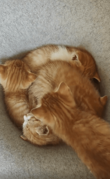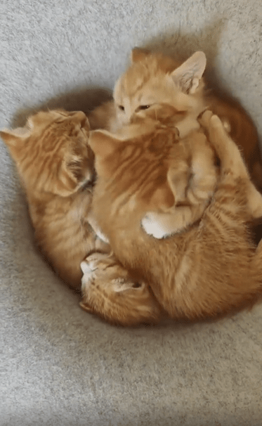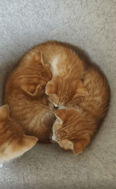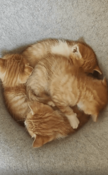 그리고 마침내 마지막 다섯 번째 고양이가 등장합니다. 이번에도 마찬가지입니다. 방석의 중심부는 이미 빼곡해 보이지만, 어느새 또 한 마리의 몸이 비집고 들어가며 다섯 마리의 새끼 고양이들이 완성하는 조용한 풍경이 펼쳐집니다. 누군가의 다리 위에 머리를 얹고, 꼬리가 얼굴을 스쳐도 아무도 불편해하지 않고, 오히려 더 깊숙이 서로에게 기대며 잠들어갑니다. 도넛 방석의 가운데는 이제 작은 생명들로 차곡차곡 포개져, 마치 살아 있는 하나의 부드러운 덩어리처럼 숨을 쉬고 있는 듯한 느낌을 줍니다.
