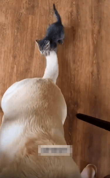 꼬리에 매달린 아기 고양이, 가만히 있는 강아지의 조용한 인내