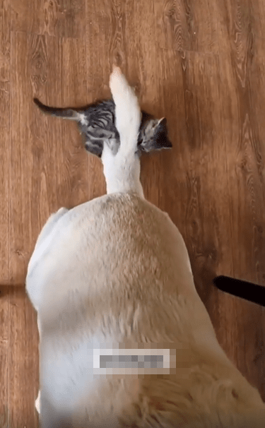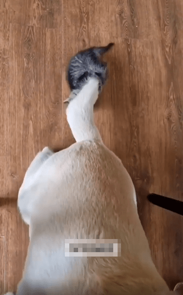 넓은 바닥 위, 커다란 강아지 한 마리가 조용히 앉아 있습니다. 움직임 하나 없이 안정된 자세로 앉아 있는 강아지의 등 뒤, 가장 눈길을 끄는 건 길고 두툼한 꼬리. 그 꼬리 끝에 뜻밖의 존재가 매달려 있습니다. 아직 털이 보송보송한 작은 새끼 고양이 한 마리가, 앞발로 강아지의 꼬리를 꼭 움켜쥔 채 대롱대롱 매달려 있는 모습이죠.