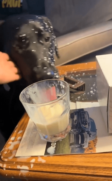 강아지의 넓은 혀는 유리컵 안에서 크게 휘둘러지고, 컵 벽에 부딪힌 음료는 튀어 올라 테이블 표면과 강아지 얼굴을 그대로 적십니다. 혀끝이 컵 바닥을 툭툭 치기라도 하듯 움직일 때마다 음료는 사방으로 퍼지고, 유리컵 옆은 점점 젖어들며 반짝이는 물방울 자국이 하나둘 생겨납니다. 강아지의 얼굴 역시 점점 흥건해지고, 눈가와 코 주변까지 음료 얼룩이 번져갑니다.