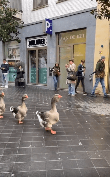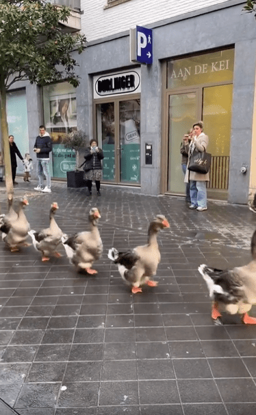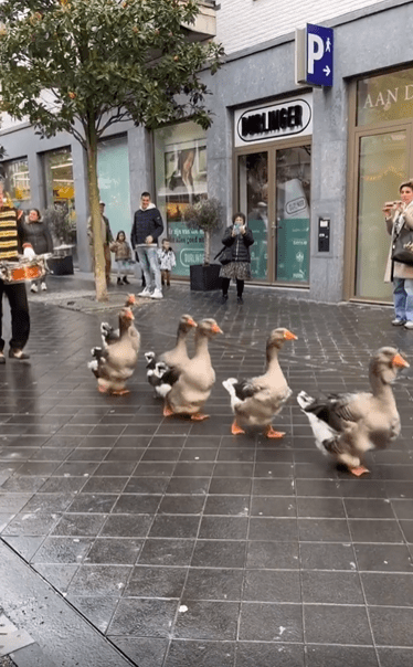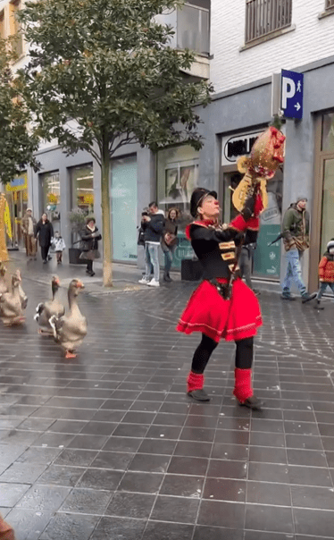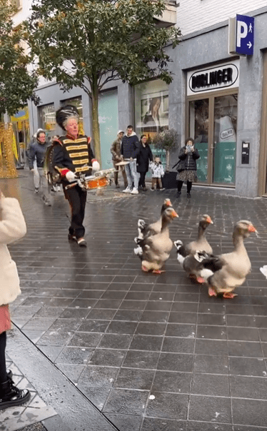 앞뒤 사람들은 유쾌하면서도 무게감 있는 걸음으로 거위 대열을 호위하듯 함께 걷고, 악기의 리듬은 거위들의 보폭과 묘하게 맞아떨어집니다. 구경하던 사람들이 휴대폰을 꺼내들고 웃음을 터뜨리는 사이, 거위들은 시선 하나 주지 않고 그저 묵묵히, 자신들이 이 퍼레이드의 주인공인 듯 걸어갑니다. 단정한 깃털, 뒤뚱거리되 흐트러지지 않는 발걸음, 그리고 우연처럼 보이는 완벽한 간격까지—이들은 분명 단순한 행진 참가자가 아닌, 퍼포먼스를 완성하는 중심축입니다.