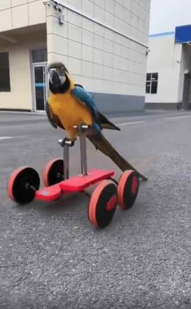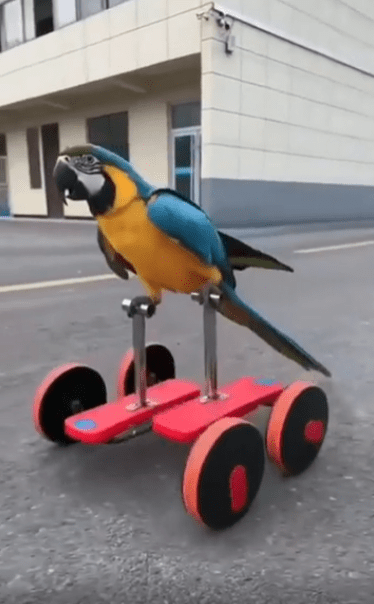 햇살이 비치는 야외 주차장, 시멘트 바닥 위에 작고 독특한 구조물이 하나 놓여 있습니다. 네 개의 작은 바퀴가 달린 프레임, 그 위에 페달이 양쪽으로 달려 있는 모습은 마치 자전거와 킥보드를 섞은 듯한 형태. 그런데 그 위에 올라탄 존재가 심상치 않습니다. 날개보다 다리가 더 바쁜, 바로 한 마리 앵무새입니다.