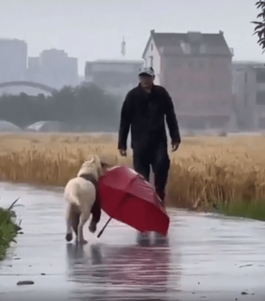 비 오는 거리에서 우산 물고 달려간 강아지의 따뜻한 배려