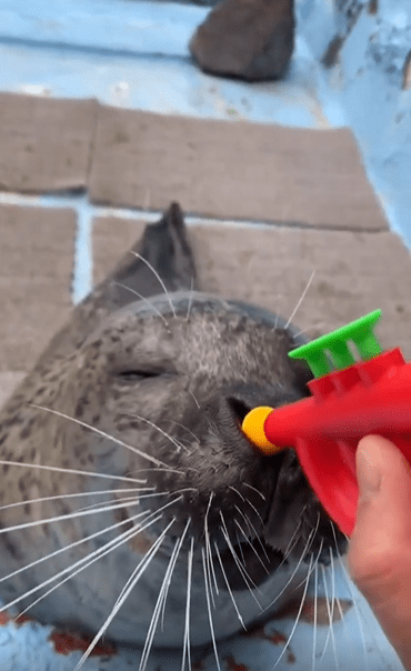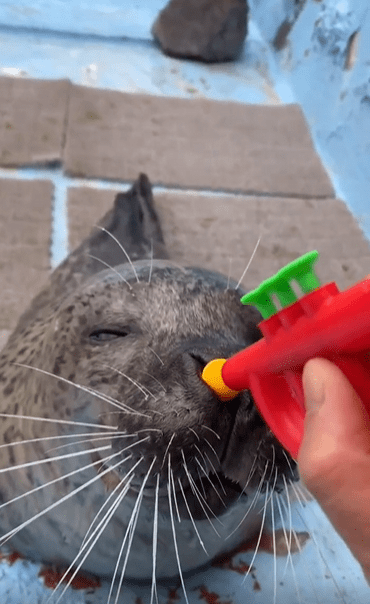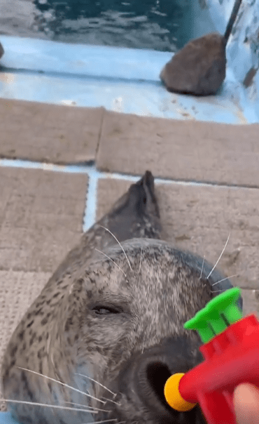 장난감 나팔을 콧구멍에 살짝 대자, 제대로 ‘뿌우!’ 하고 불어버린 물범