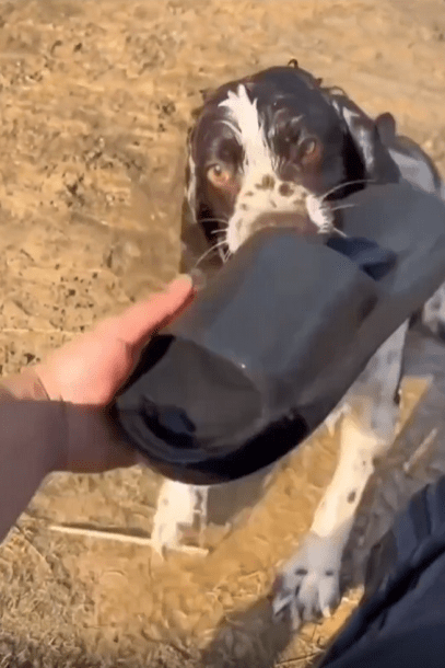 강아지는 순순히 슬리퍼를 내줍니다. 주인은 젖은 슬리퍼를 들고, 이제 막 신으려는 찰나—강아지가 다시 휙 하고 슬리퍼를 낚아챕니다. 당황한 주인이 다시 손을 내밀자, 이번엔 또 아무렇지 않게 슬리퍼를 내어주죠. 그리고 다시 신으려 하자마자, 또 한 번 슬리퍼를 낚아채는 강아지. 그 눈빛엔 “아니, 그거 신는 거 아니잖아요. 던지는 거잖아요?”라는 순수한 의도가 담겨 있습니다.