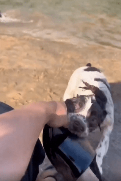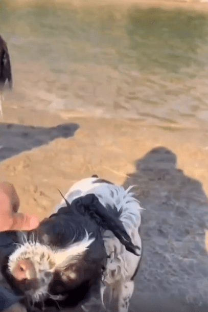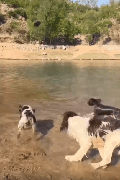 몇 차례 슬리퍼를 주고받다 보니, 주인은 마침내 눈치 챕니다. 슬리퍼는 ‘신는 물건’이 아니라, ‘던져주는 장난감’이라는 것. 결국 주인은 포기한 듯 웃으며 슬리퍼를 다시 물가 쪽으로 휙— 던져버립니다. 그러자 세 마리 강아지들은 이 순간을 기다렸다는 듯 동시에 물가를 향해 질주합니다. 슬리퍼가 닿기도 전에 이미 물살을 가르고 달려가는 모습엔, 진심 어린 놀이의 즐거움이 고스란히 담겨 있죠.