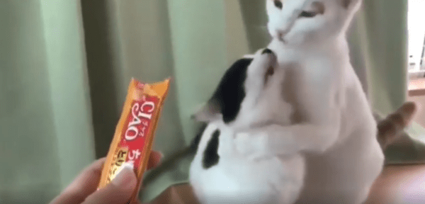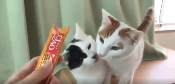 작은 간식 스틱이 주인의 손끝에서 천천히 내려옵니다. 끝부분엔 말랑한 고양이 간식이 살짝 묻어 있고, 그걸 본 두 마리의 고양이가 동시에 반응합니다. 앞발을 딛고 앞으로 다가오며, 입을 살짝 벌리고 혀를 내밀며 낼름낼름—