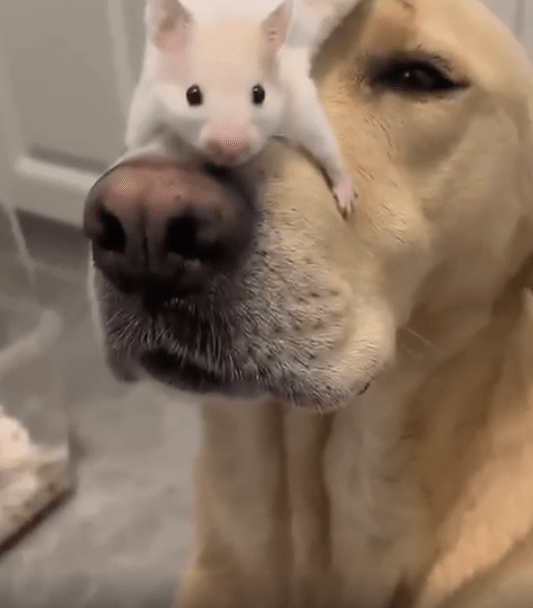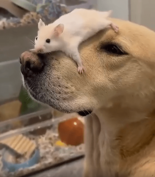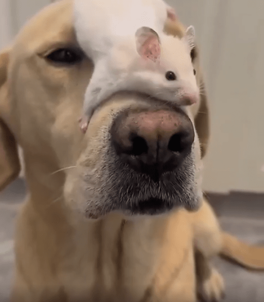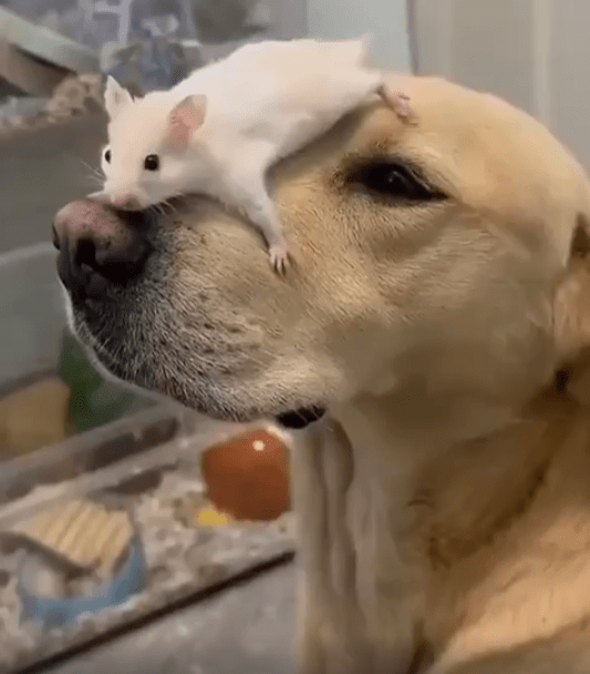 조용한 실내, 커다란 개 한 마리가 있습니다. 듬직한 체격이 주는 안정감 때문인지, 그 위에 하얀 작은 쥐 한 마리가 몸을 맡기고 있습니다. 그런데 이 장면, 단순히 개의 몸 어디쯤에 올라가 있는 게 아닙니다. 작은 쥐는 큰개의 콧잔등 위에, 마치 세상 제일 편안한 침대를 찾은 듯 온몸을 활짝 펼친 채 누워 있습니다.