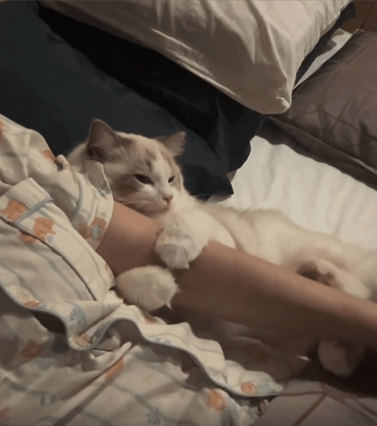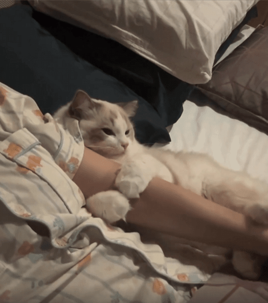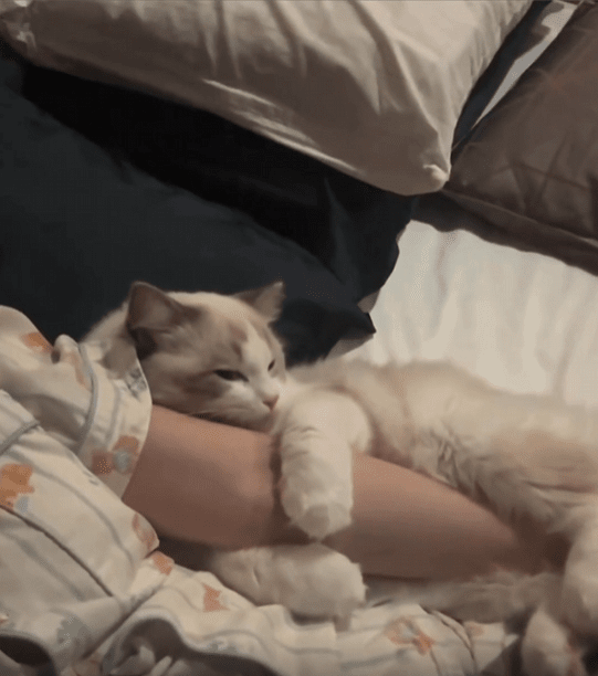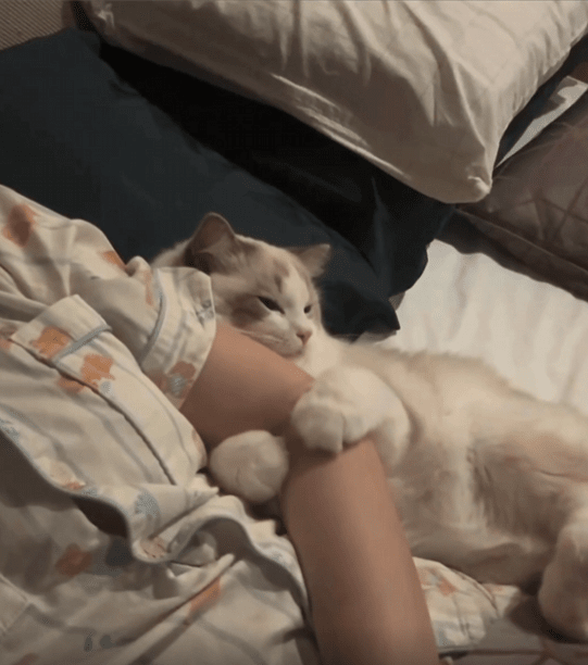 고양이 한 마리가 주인과 함께 시간을 보내고 있습니다. 고양이는 주인의 팔을 품에 꼭 끌어안고 있었고, 작은 두 앞발은 마치 소중한 보물을 품은 듯 단단하게 팔을 감싸 안았습니다. 주인이 천천히 몸을 일으키려 하자, 고양이는 더욱 팔을 움켜쥐듯 꼭 껴안으며 떨어지지 않으려 합니다.