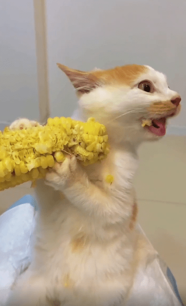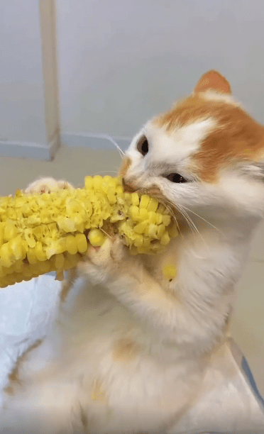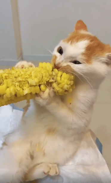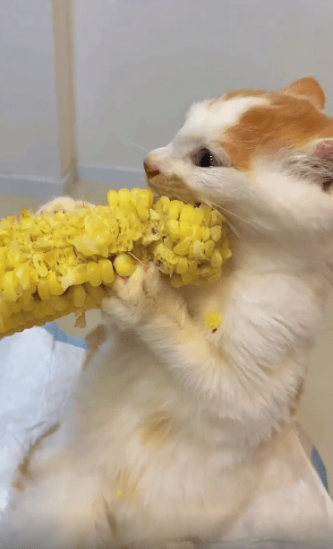 한 자리에 옹크리고 앉은 고양이 한 마리, 눈앞에 놓인 커다란 옥수수에 시선을 고정하고 있습니다. 고개를 살짝 갸웃거리며 킁킁 냄새를 맡던 고양이는 이내 호기심을 이기지 못하고 조심스레 입을 댑니다. 작은 송곳니로 알알이 박힌 옥수수 알갱이를 톡, 하나씩 뜯어먹기 시작하는데요, 그 모습이 어찌나 진지하고 사랑스러운지 보는 사람의 마음까지 간질간질해집니다.