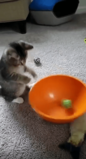 고양이는 점점 더 적극적으로 움직입니다. 한쪽 발로 보올을 톡 건드리고, 다른 발로는 공을 굴려 넣기를 반복하며 자신만의 '놀이법'을 만들어갑니다. 보올이 가볍게 흔들릴 때마다 고양이의 반응은 신이 나 있고, 한 번씩 튀어나오는 공을 다시 잡아 보올로 밀어넣을 때는 마치 퍼즐을 푸는 듯한 진지한 얼굴이 됩니다. 그 조그만 몸짓 하나하나에 집중과 놀이의 즐거움이 가득 담겨 있었습니다.